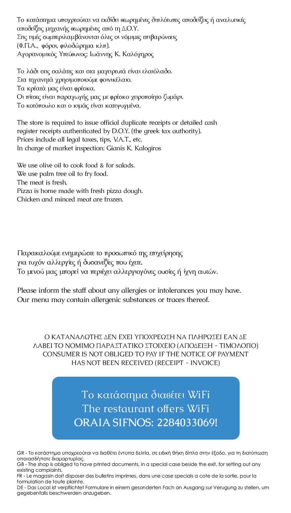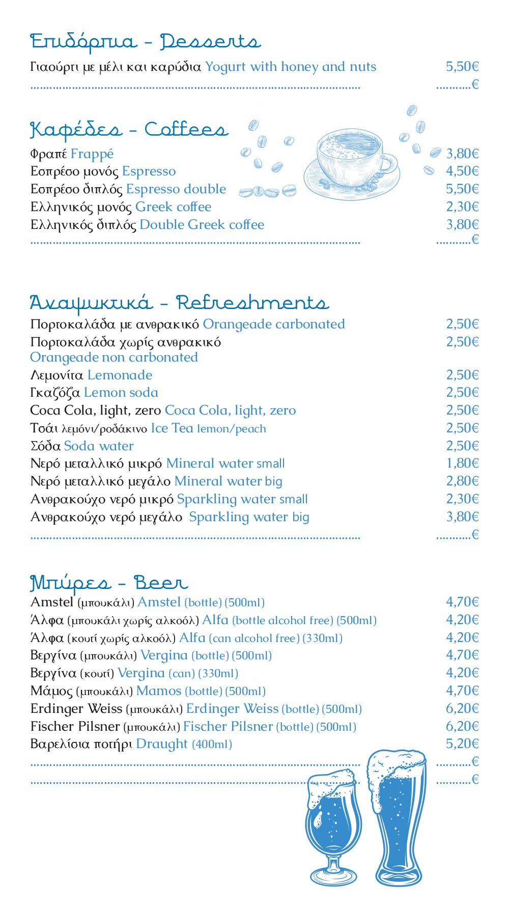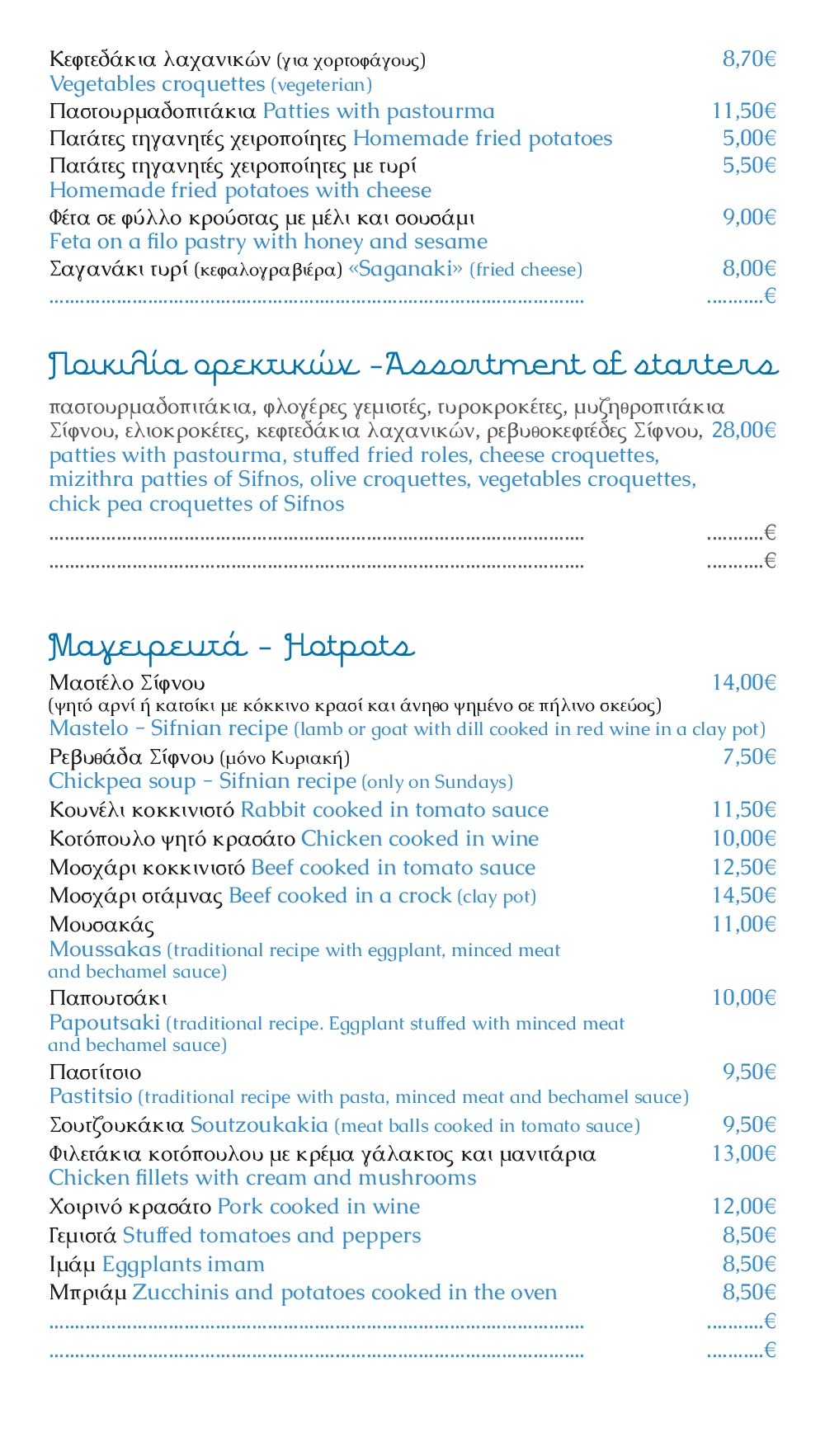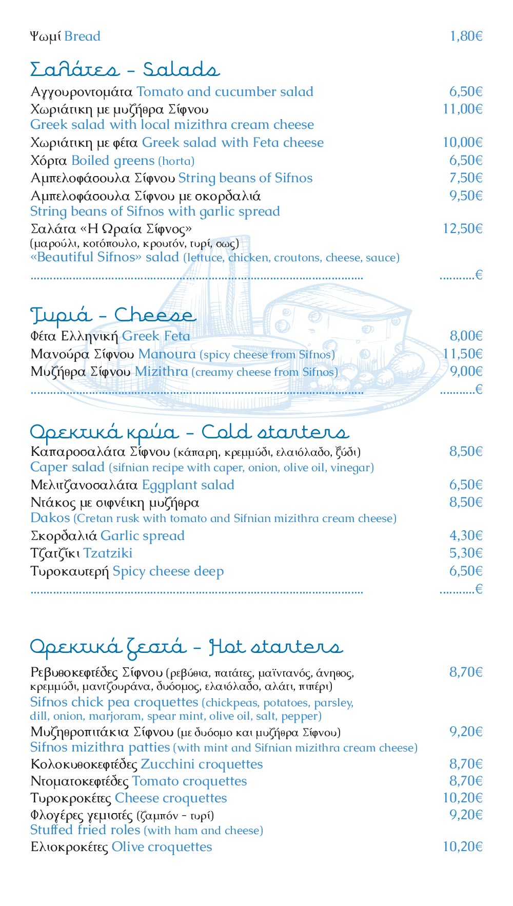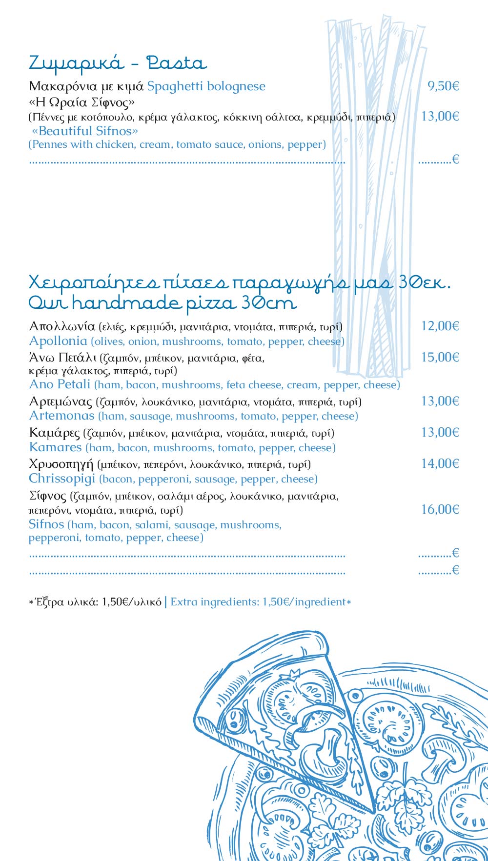 Τα πλούσια ορεκτικά μας, τις δροσιστικές σαλάτες μας, τα με αγάπη φτιαγμένα μαγειρευτά μας ή κάποια από τις πίτσες της πλούσιας λίστας μας με το δικό μας χειροποίητο ζυμάρι.